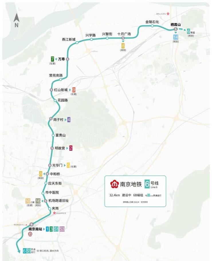 6号线工程起点为栖霞山站,终点为南京南站,线路长度32.4公里,全部为地下线。