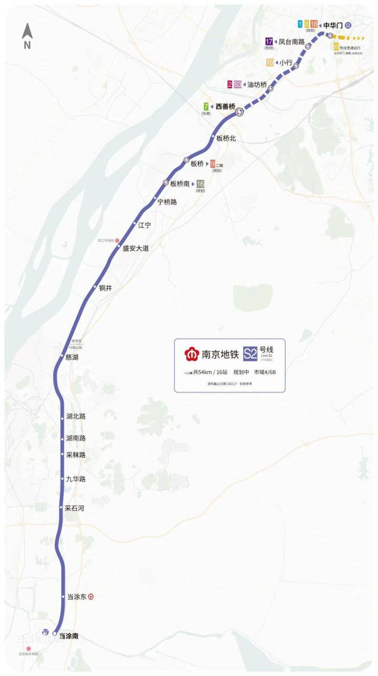 地铁S2号线全长54千米,其中一期工程南京段26.5千米、马鞍山段27.5千米;共设站16座,其中南京段8座、马鞍山段8座。