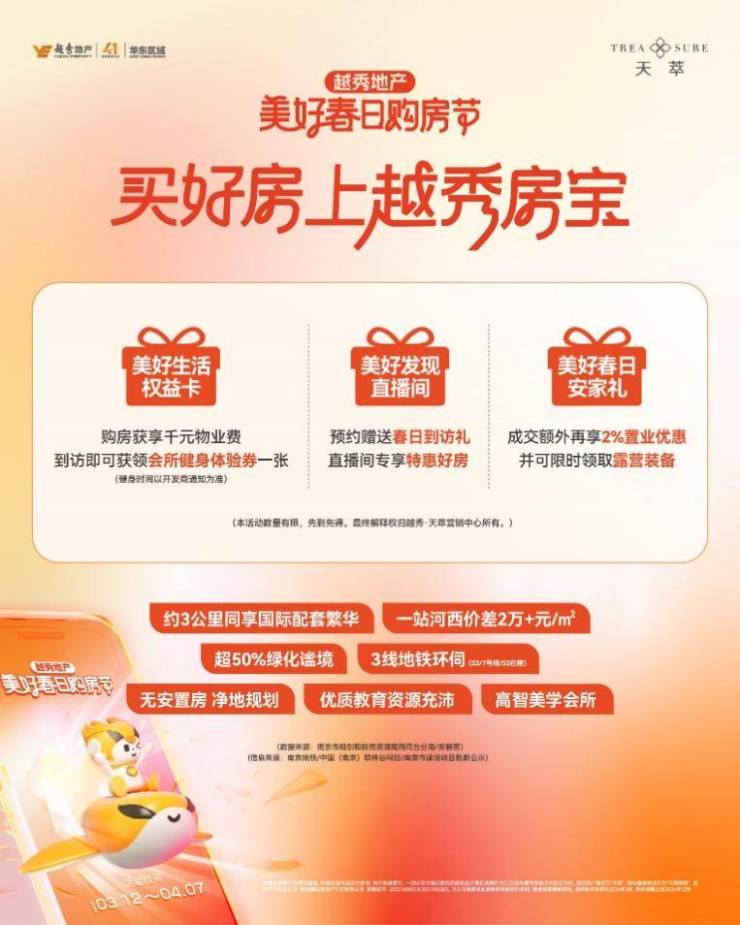 把握楼市小阳春的置业好时机,越秀房宝推出“美好春日购房节”,三大权益美好入心:1、美好生活权益卡:购房获享千元物业费,到访即可获领会所健身体验券一张(健身时间以开发商通知为准);2、美好发现直播间:预约赠送春日到访礼,直播间专享特惠好房;3、美好春日安家礼:成交额外再享2%置业优惠,并可限时领取露营装备(本活动数量有限,先到先得。最终解释权归越秀·天萃营销中心所有。)