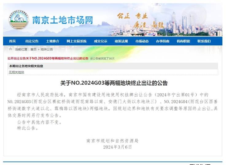 刚刚,南京土地市场网发布公告,安德门G03、雨核G04两幅地块因规划边界和地铁有关要求调整等原因终止出让。
