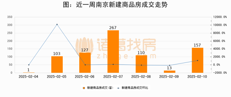 根据南京市住房保障和房产局数据显示,2025年02月10日南京新建商品房成交157套,较昨日增加144套,环比上涨1107.7%