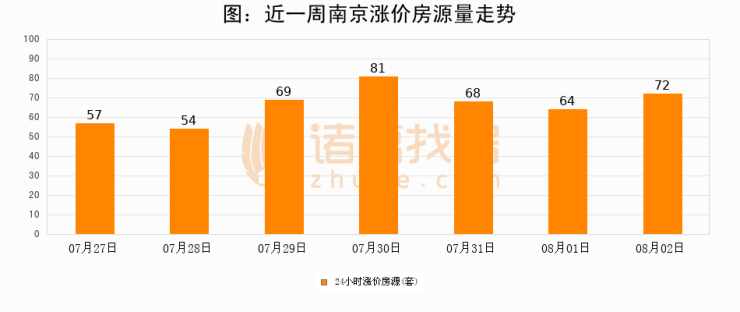 根据诸葛找房数据显示,南京24小时涨价房源量为72套,较08月01日增加8套,环比上涨12.5%。与此同时,涨价房源占比小幅扩大,业主信心有所提升。