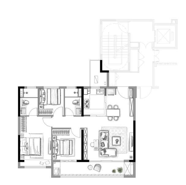 建面约112㎡奢适三房,南向三开间,直面青翠山景;LDKB一体化横厅设计,多元互动,承载大家庭的温馨。