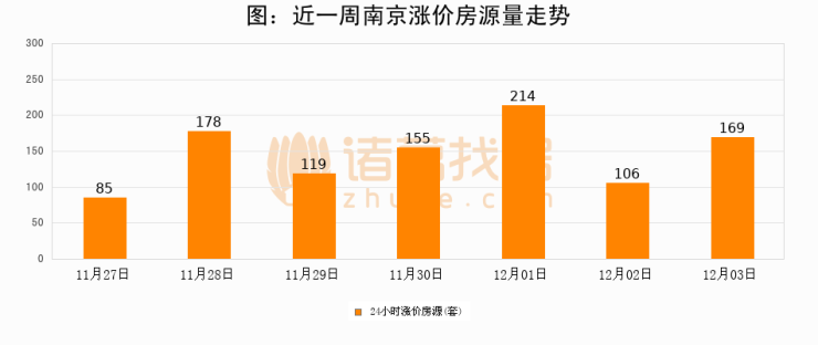根据诸葛找房数据显示,南京24小时涨价房源量为169套,较12月02日增加63套,环比上涨59.4%。与此同时,涨价房源占比小幅扩大,业主信心有所提升。