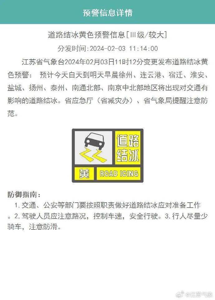 江苏省气象台2024年02月03日11时12分变更发布道路结冰黄色预警:预计今天白天到明天早晨徐州、连云港、宿迁、淮安、盐城、扬州、泰州、南通北部、南京中北部地区将出现对交通有影响的道路结冰。省应急厅(省减灾办)、省气象局提醒注意防范。