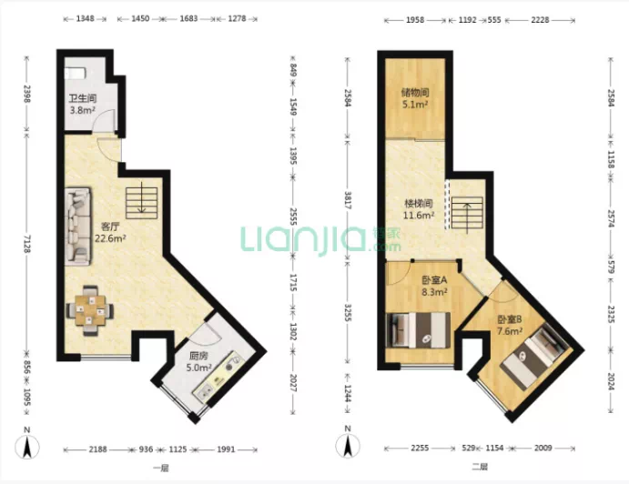 这是东渡新锐大厦一套非规则户型的公寓,面积仅59㎡左右,但是上下两层打通,原小区为毛坯交付,客厅5.2米挑高,原房主改成做了自住装修,两房一厅一厨两卫,楼上楼下各一个卫生间,楼上约40.5㎡,厨房通燃气。