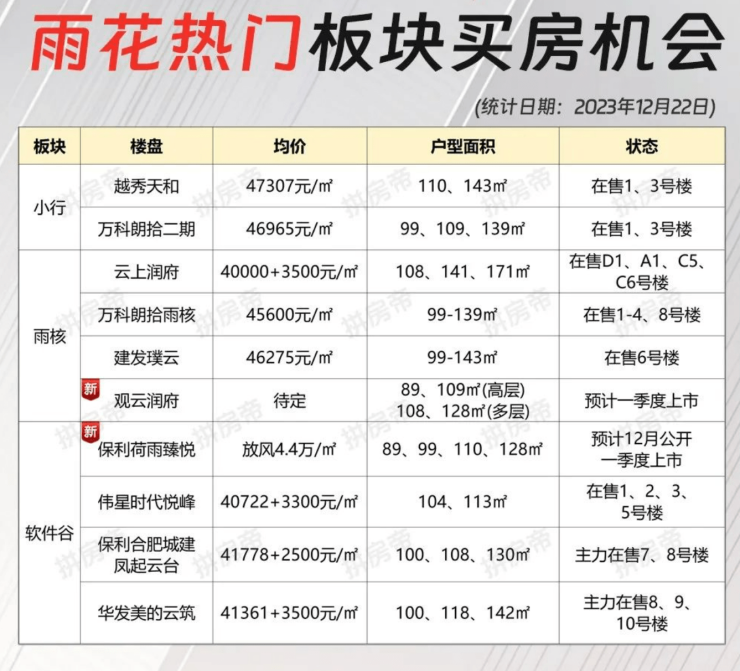 目前在售的三家分别为云上润府、万科朗拾雨核和建发璞云。此外明年纯新盘观云润府也将首开,项目规划了洋房+高层的产品,其中洋房产品在板块中比较稀缺,喜欢低密产品的买房人可以关注一波。