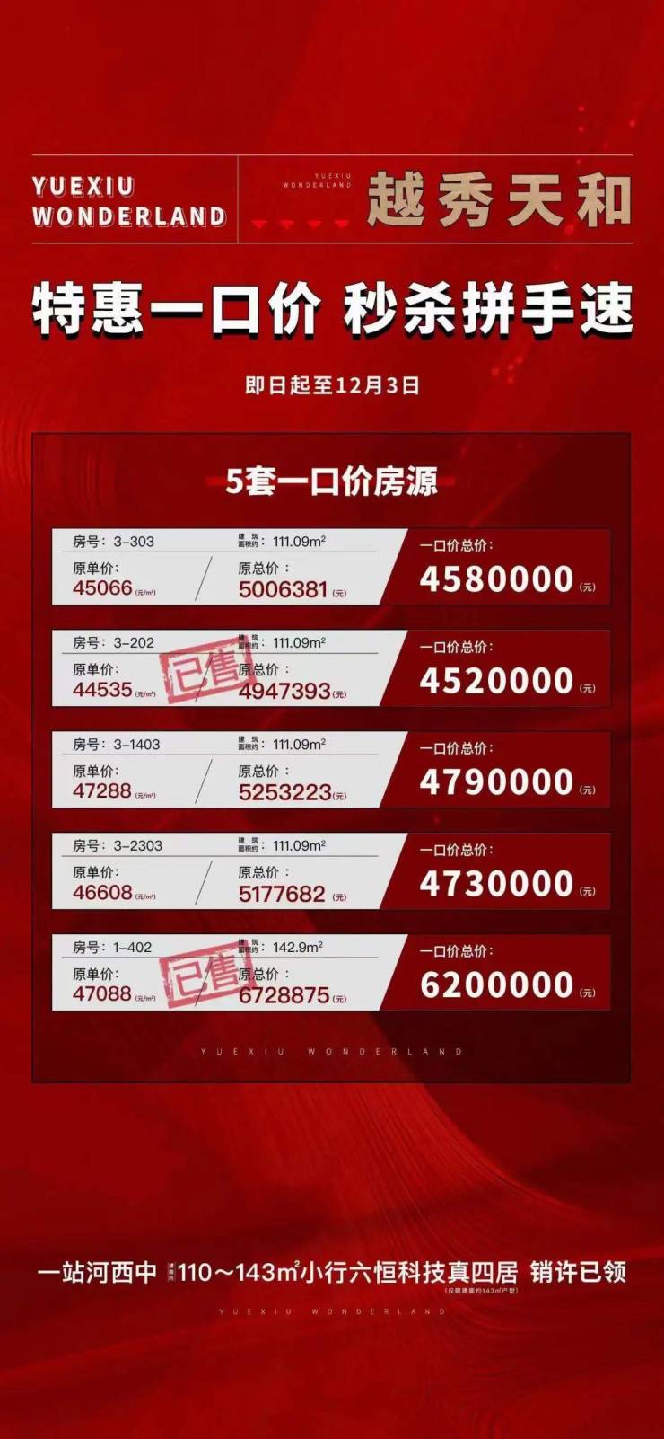 前段时间项目也拿出了5套房源做特惠一口价,4套建面约110㎡、1套建面约143㎡。其中,单套最低优惠总价约42.6万,最高优惠总价则高达52.8万!