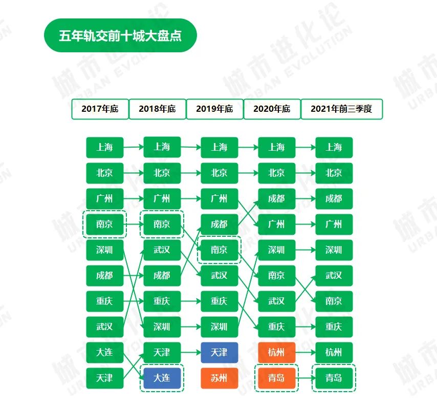 回到轨交运营里程的“十强榜单”,近几年城市的位次变化,也印证着这一点。