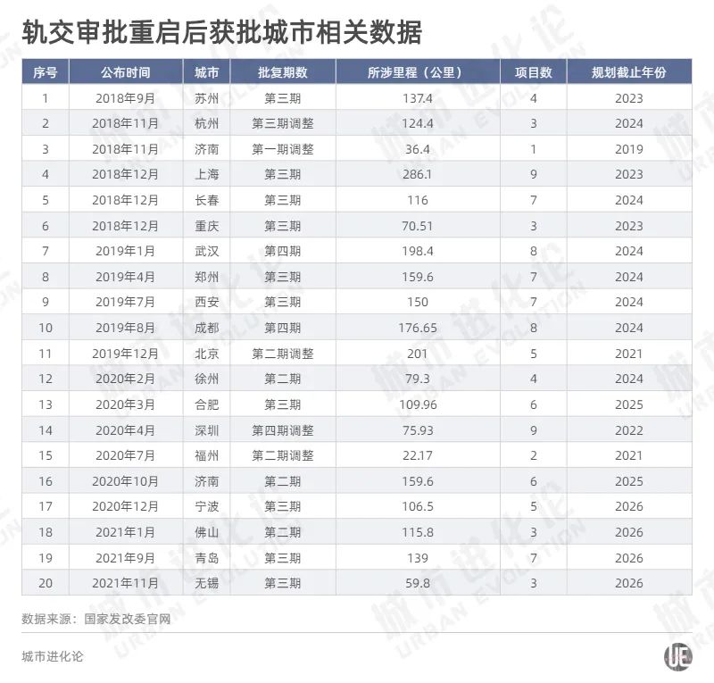 视线拉长,2018年7月,在暂停近一年后,国家发改委重启城市轨道交通建设规划审批。当时,同步提高的“门槛”让许多中小城市地铁梦碎,但满足条件的头部城市,开通新线的脚步却不减反增。