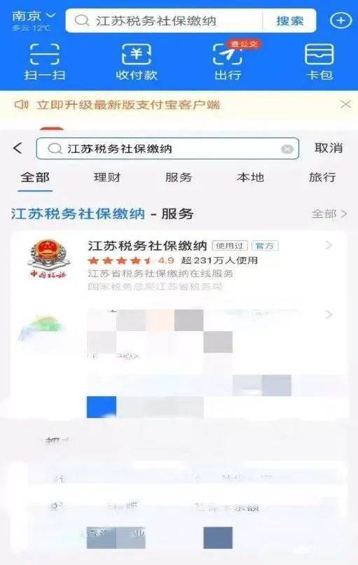 支付宝首页搜索“江苏税务社保缴纳”,点击进入进行缴费操作。