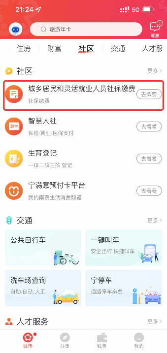 通过“我的南京”APP,“首页—城乡社保缴费快捷菜单”或“社区—城乡居民和灵活就业人员社保缴费”,点击社保缴费办理模块,进行缴费操作。