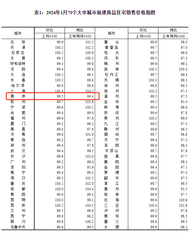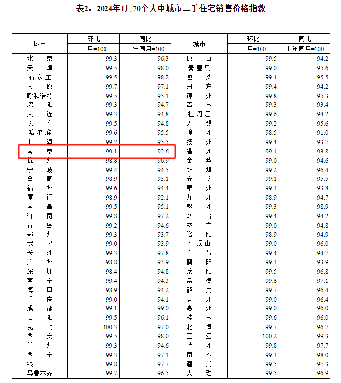 其中,1月南京新房价格环比下跌0.5%、同比下跌3.6%,二手房价格环比下跌0.9%,同比下跌7.4%。
