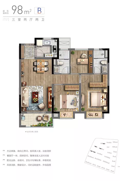 86㎡户型打造的三开间朝南,南向双卧室配备了180°环景飘窗,相当于赠送2㎡空间,一来可以观赏四季美景,二来也保障了房间内的通透性和采光性。