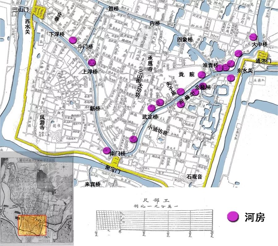 南京城内河道纵横(内秦淮河外,另有金川河、运渎、青溪、杨吴城濠等等),然河房却基本沿内秦淮分布,且商业与文化越繁荣,河房分布越密集。由此可见除自然地理因素制约外,社会需要在河房建造与分布上的影响。