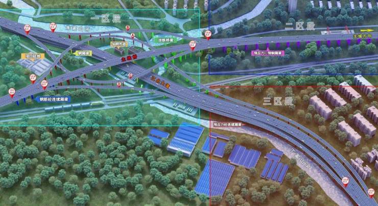 江北大道互通由1条主线桥和4条匝道组成,其中主线桥和左右两翼匝道需要穿过江北大道快速路,且不能影响交通。因此,上跨桥梁均为提前预制的钢箱梁。