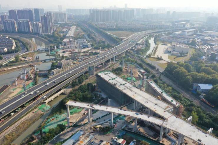 在主线桥完成顶推后,还将实施左右两翼匝道桥跨路顶推,尤其是北侧匝道桥,呈圆弧状,难度不小。目前项目部正加快推进跨快速路顶推,东侧预制高架箱梁铺装,力争明年完成互通建设,并向东与横江大道互通对接,融入江南江北城市快速路体系。