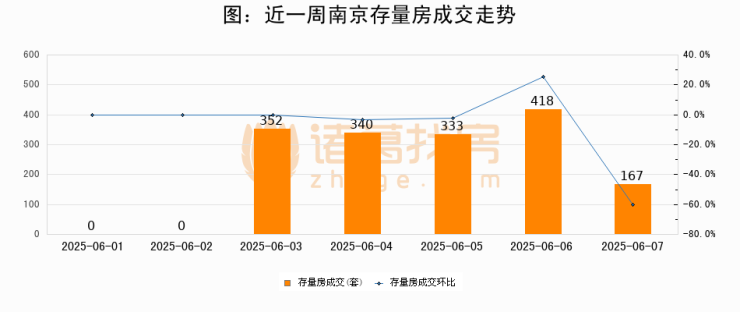从存量房来看,2025年06月07日南京存量房单日成交167套,比昨日减少251套,环比下降60.1%。从近一周存量房成交来看,南京存量房日均成交套数为230套,06月07日单日成交167套,低于近一周平均水平27.4%。