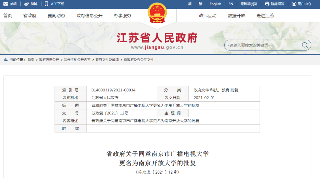 日前,江苏省政府公布了南京市广播电视大学更名为南京开放大学的批复。