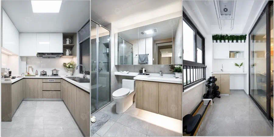 价值1500元/㎡的升级装修包中,三大件齐全,还有墙纸+实木复合地板,方太洗碗机+恩仕智能坐便器,厨卫的五金为摩恩、科勒等知名品牌,品质感不错。