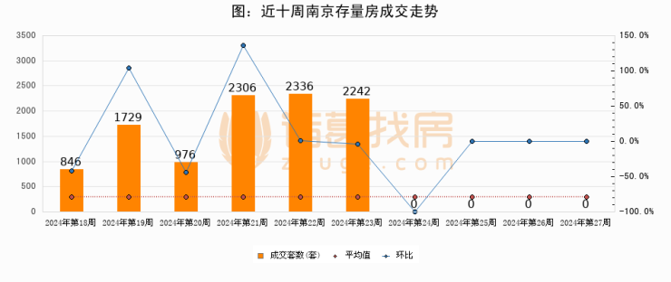 存量房方面,第27周南京存量房成交0套,较上周持平。从近十周成交走势来看,周均成交套数为1043套,本周低于平均水平100%。