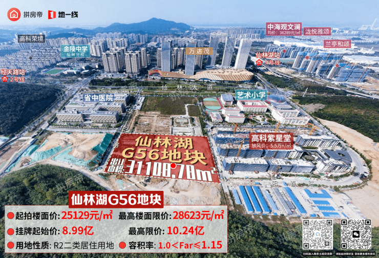 今天出让的仙林湖G56地块容积率仅1.15,地块东侧就是容积率1.2的高科紫星堂,未来将与高科紫星堂“面对面”竞争。