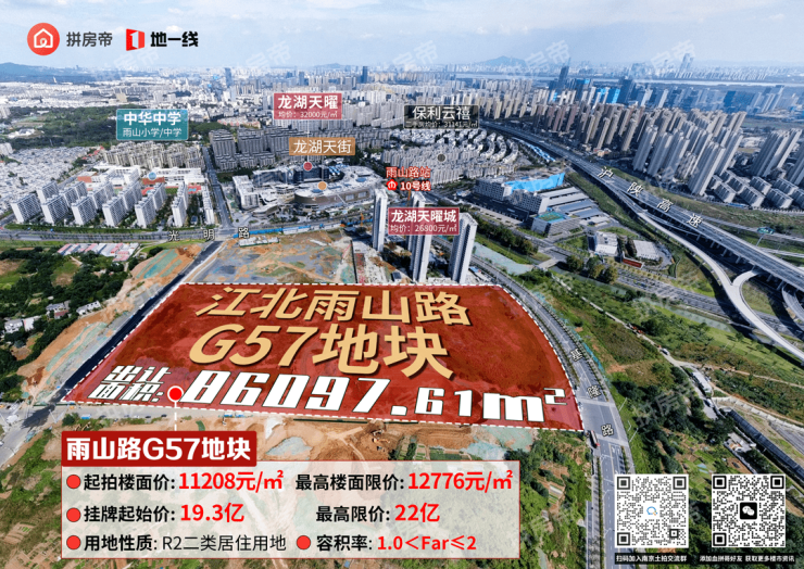 雨山路G57地块紧邻龙湖天曜城,周边有龙湖雨山天街、10号线雨山路地铁站、兰溪公园等,生活配套资源丰富。地块周边住宅小区众多,有在售的中建翰林雅境,次新房保利云禧等
