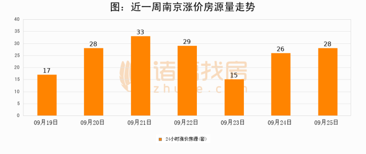 根据诸葛找房数据显示,南京24小时涨价房源量为28套,较09月24日增加2套,环比上涨7.7%。与此同时,涨价房源占比小幅扩大,业主信心有所提升。