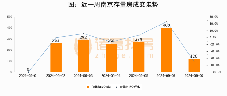 从存量房来看,2024年09月07日南京存量房单日成交120套,比昨日减少280套,环比下降70%。从近一周存量房成交来看,南京存量房日均成交套数为229套,09月07日单日成交120套,低于近一周平均水平47.6%。