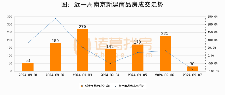 根据南京市住房保障和房产局数据显示,2024年09月07日南京新建商品房成交30套,较昨日减少195套,环比下降86.7%