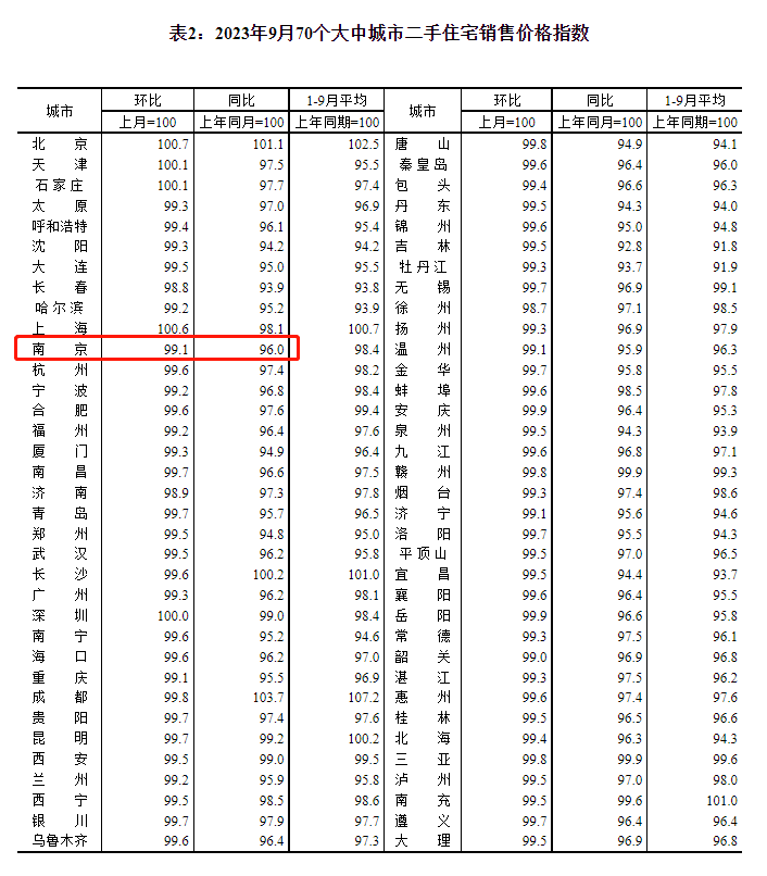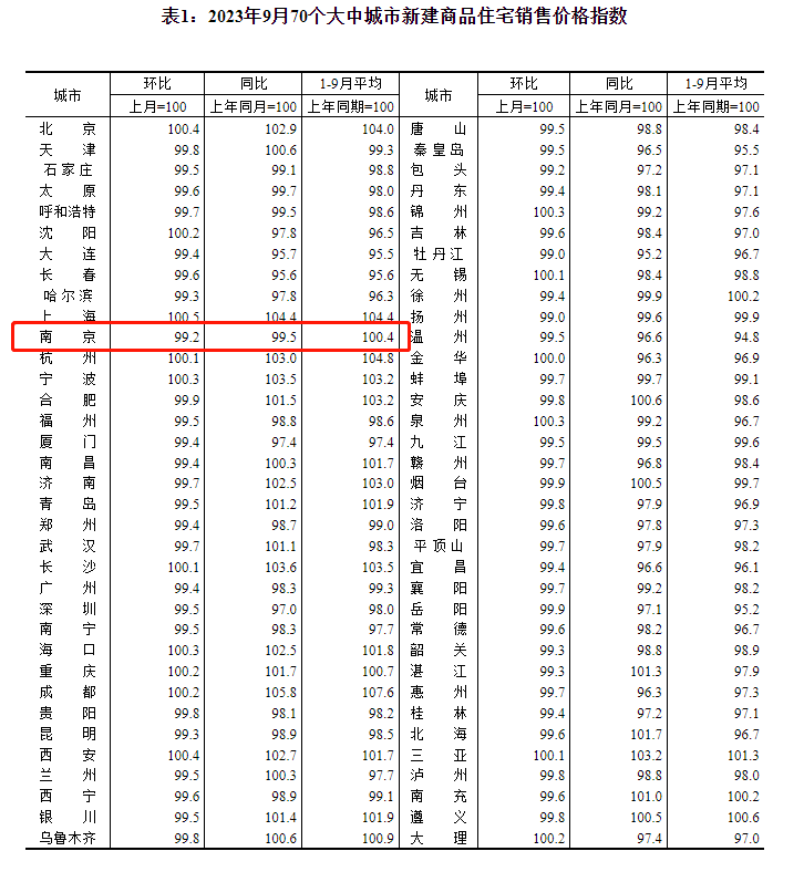 今天上午,国家统计局最新发布了2023年9月份70个大中城市商品住宅销售价格变动情况统计数据。其中,9月南京新房价格环比下跌0.8%、同比下跌0.5%,二手房价格环比下跌0.9%,同比下跌4%!
