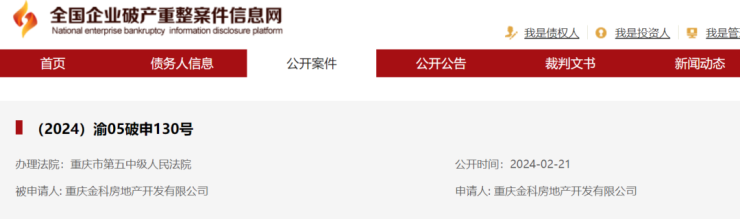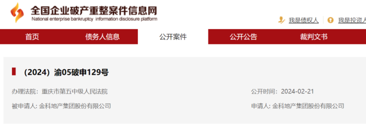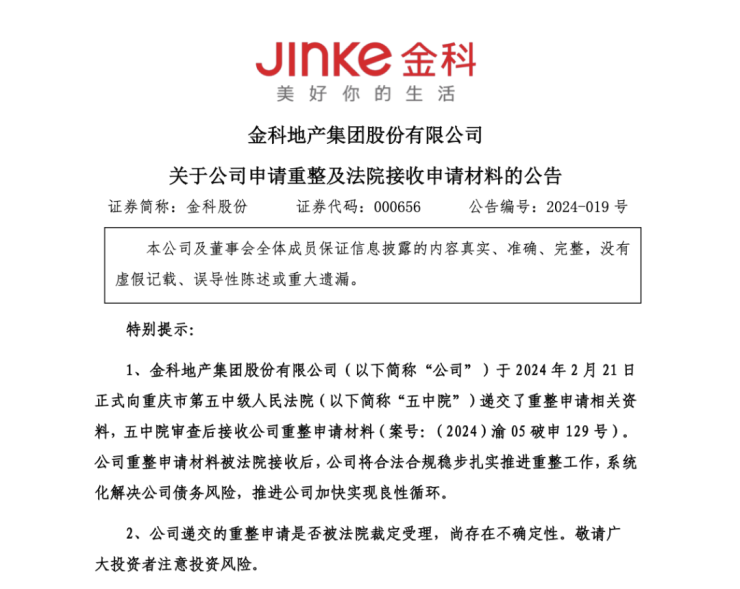 2月21日晚间,金科股份发布公告,公司及公司全资子公司重庆金科房地产开发有限公司,已于当日正式向重庆市第五中级人民法院递交了重整申请相关资料,五中院经审查后接收公司重整申请材料,案号分别为(2024)渝05破申129号、(2024)渝05破申130号。