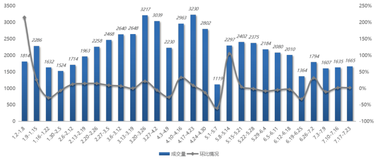 上周,南京全市二手房成交1665套(含高淳、溧水),环比小幅上涨1.8%,其中主城九区成交量1543套。从成交走势来看,7月以来,南京二手房交易量十分稳定,周成交均在1600-1700套,波动幅度较小,市场处于相对平静期,整体较二季度仍有所下滑。