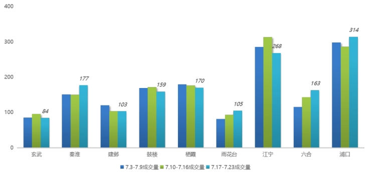 从区域情况看,浦口单周成交314套,反超江宁升至全市第一位,也是唯一突破300套的区域,江宁上周成交268套,两区交易量仍明显高于其他区域。环比来看,各区成交有小幅波动,其中秦淮、雨花台、浦口、六合都有所上涨,最高涨幅达18%,建邺交易量持平,而玄武、鼓楼、江宁、栖霞则有小幅回落。