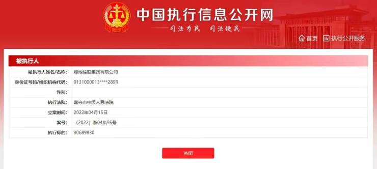 中国执行信息公开网披露,绿地控股集团有限公司新增被执行人信息,执行标的90689832元,执行法院为浙江省嘉兴市中级人民法院,关联案件涉及股权转让纠纷,案号(2022)浙04执95号。