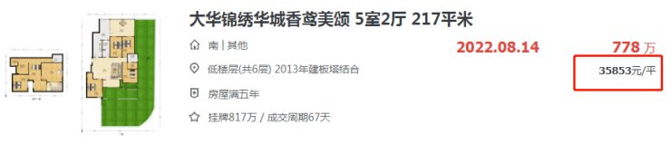 桥北的大华锦绣华城香鸢美颂8月成交了一套底跃,建面217㎡,总价778万,成交单价约3.5万/㎡。小区挂牌均价仅28852元/平。