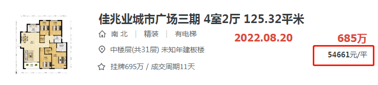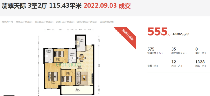 建面约115.43平,挂牌价575万,成交价555万,成交单价48082元/平,成交周期仅35天。这个成交价要比大部分5万出头的挂牌价低一些。