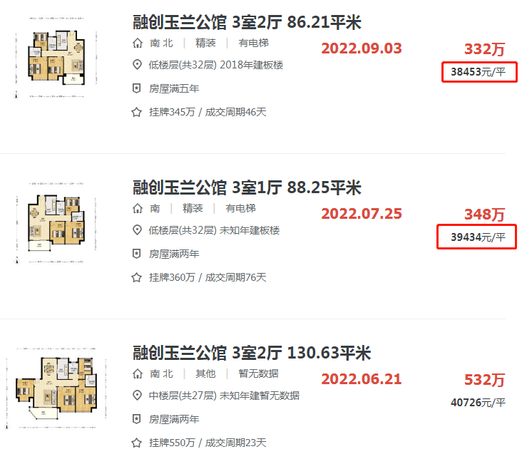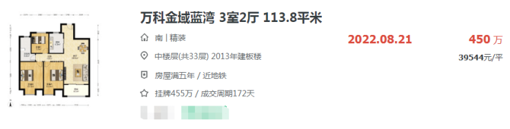 一直卖到4万+的万科金域蓝湾,最近几套房源的成交价也跌到了3字头。