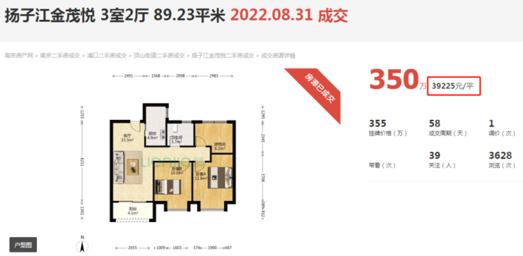 扬子江金茂悦一套89平的房源,仅以350万成交,均价39225元/平,这也是链家上该小区成交的排名前列套二手房,和之前业主的挂牌价与市场预期都有不小的差距。