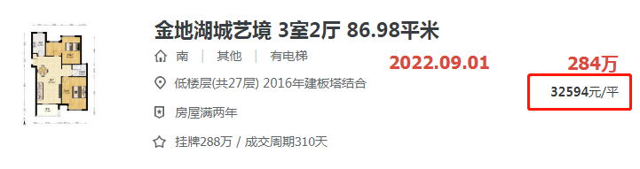 仙林湖的金地湖城艺境,较新成交的一套86.98平的房源,总价284万,单价仅32594元/平,远低于小区3.6万/平的挂牌均价。