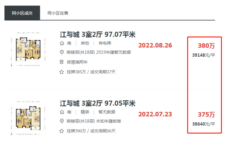 江与城在8月底又成交了一套房源,总价380万,均价也仅有3.9万/平,与7月成交的排名前列套房源价格相差无几。