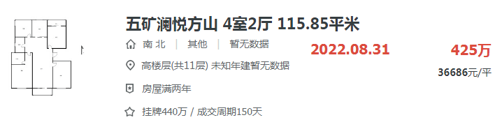 方山的五矿澜悦方山在上个月底成交了一套建面约115.85㎡的房源,成交总价425万,单价36686元/㎡,创下目前小区较高成交价。此前小区卖出的3套95平房源成交单价都在3.1万/平左右。