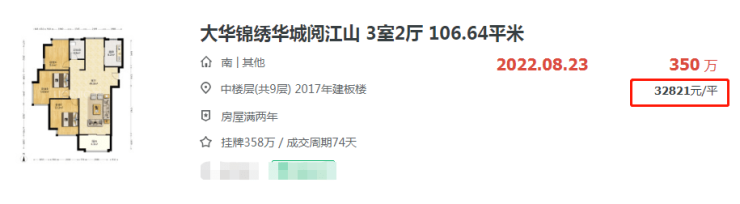 另一个组团大华锦绣华城阅江山在上个月也成交了一套建面约106㎡,成交总价350万,单价32821元/㎡,高于同小区普遍成交价。