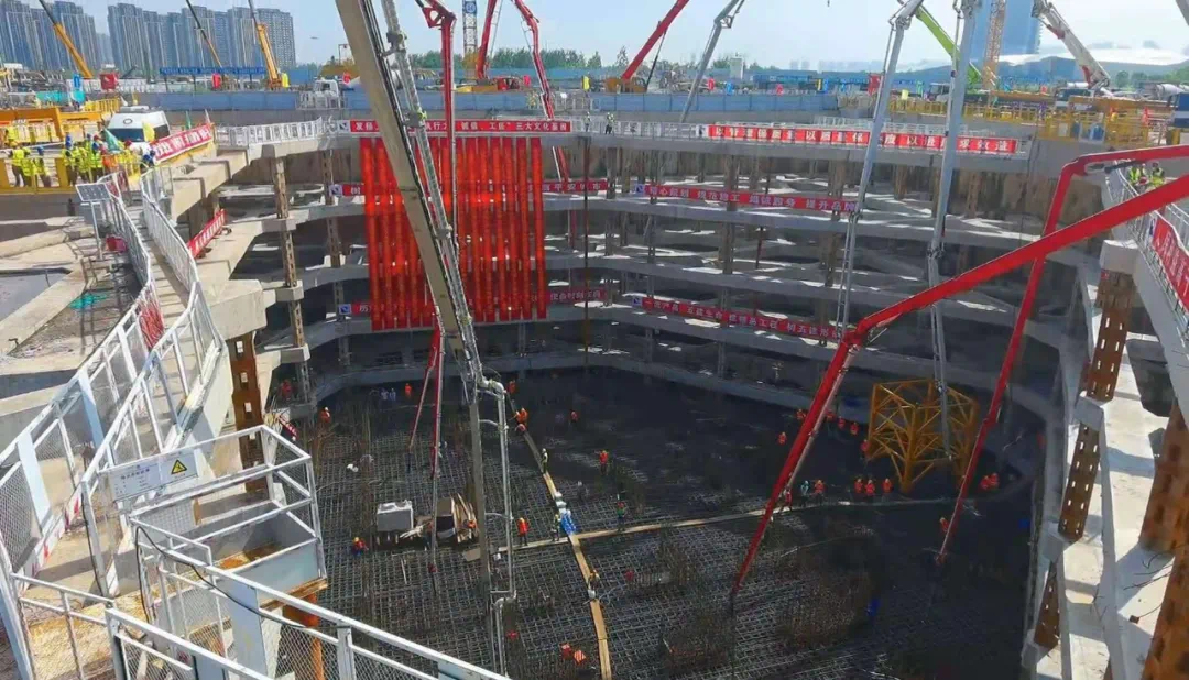 这么大体积底板混凝土是经过“量身定制”的,混凝土保供方江苏双龙集团负责人介绍说,混凝土配合比经过试验室技术人员根据设计参数要求,通过原材料的挑选、配合比的设计、多次搅拌机小试验证和机台生产浇筑验证的全过程而获得。出具的混凝土配合比从混凝土优异性、合理性和稳定性等方面经行业专家审核最终确定。