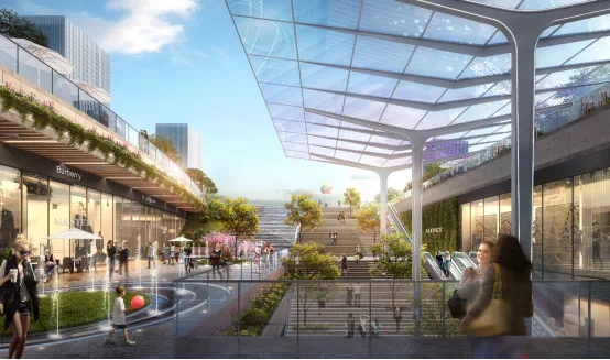 地块内下沉广场效果图项目打破常规的地下空间设计,通过设置采光天窗和提高建筑层高等方法,将“风光水绿”引入商业大平层,为地下空间提供阳光、引入绿植等,像是 “阳光房”一般。也就是说,逛街购物时,阳光将洒进负一层,照在消费者身上,并没有在地下的压抑感。