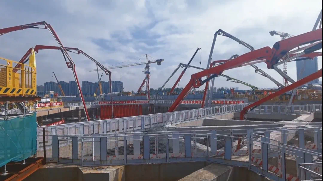 据了解,本次浇筑的大体积混凝土为超高层核心筒底板,共计浇筑混凝土约34000立方米,为保证大底板施工质量,需连续不间断浇筑约72小时,共投入11辆汽车泵、8辆车载泵、混凝土泵车230辆。现场就可以看到十几台泵机同时协作,场面十分壮观。