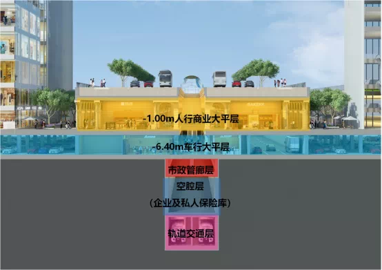 地下空间效果图地下空间项目遵从“小街区、密路网”开发格局,对巨大开发单元进行整体开发,由上而下分为商业大平层、停车交通大平层、市政综合管廊层、管廊夹层、空腔层和两层的地铁通行层,总计7层。整体依托TOD与站城一体化概念,严格遵从“一体化设计、精细化布局、生态化营造、低碳化建筑、智慧化管理、便捷化换乘”设计理念。