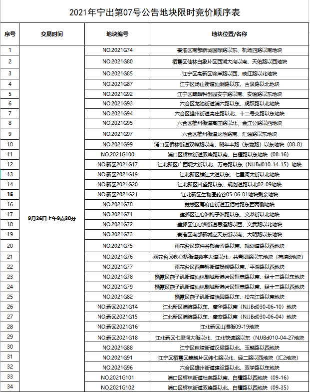 就在刚刚,南京土地市场网上也公布了该批土地的出让顺序:该批42幅地块将于9月26日早9点30分开始竞拍,直至当日17:00,已启动限时竞价程序的地块于当天完成竞价,其余地块在第二天9:30继续开始下一块地的限时竞价,依次类推。