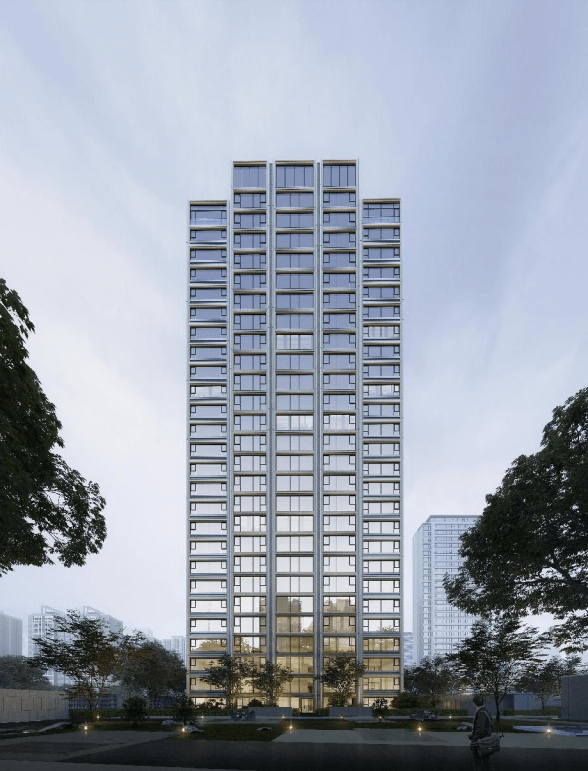 采用干挂体系,强调片墙与框架感,大面积中空LOW-E玻璃设计,浅色与中灰色复合铝板、灰色石材、呈现典雅大气的艺术之美。