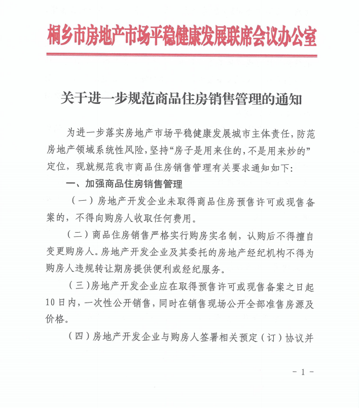 通知指出,为进一步落实房地产市场平稳健康发展城市主体责任,防范房地产领域系统性风险,坚持“房子是用来住的,不是用来炒的”定位,对桐乡市商品住房销售管理加强规范。